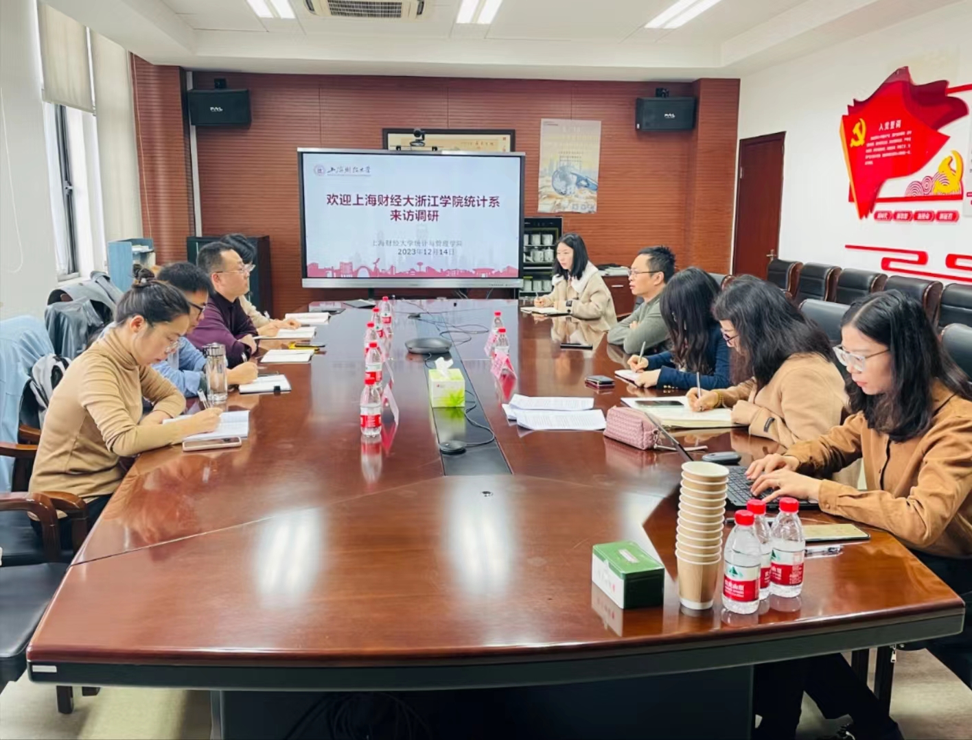武斌感谢上海财经大学统计与管理学院的热情接待和对浙江学院的支持与帮助,汇报了近两年来,在母体学校专业带头人的指导下,统计系在专业建设、科研成果及学科竞赛等方面所取得的成绩及此次学习考察的目的,希望今后在师资培养、人才引进及专业建设上能给予更多的指导帮助,提升浙江学院学科建设水平和服务社会能力。