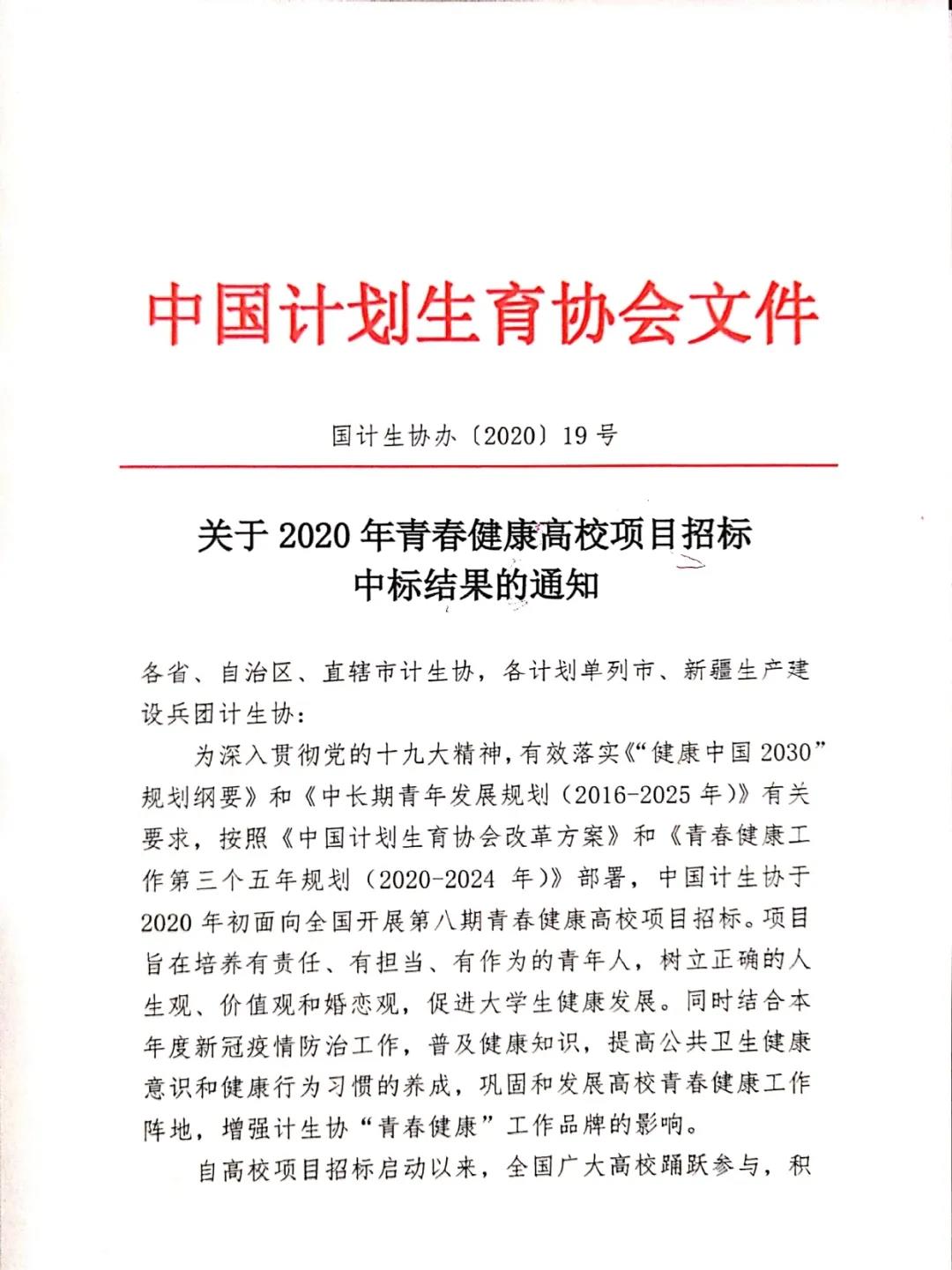 为深入贯彻党的十九大精神,有效落实《“健康中国2030”规划纲要》和《中长期青年发展规划(2016-2025年)》有关要求,按照《中国计划生育协会改革方案》和《青春健康工作第三个五年规划(2020-2024年)》部署,中国计生协于2020年初面向全国开展第八期青春健康高校项目招标。项目旨在培养有责任、有担当、有作为的青年人,树立正确的人生观、价值观和婚恋观,促进大学生健康发展。同时结合本年度新冠疫情防治工作,普及健康知识,提高公共卫生健康意识和健康行为习惯的养成,巩固和发展高校青春健康工作阵地,增强计生协“青春健康”工作品牌的影响。